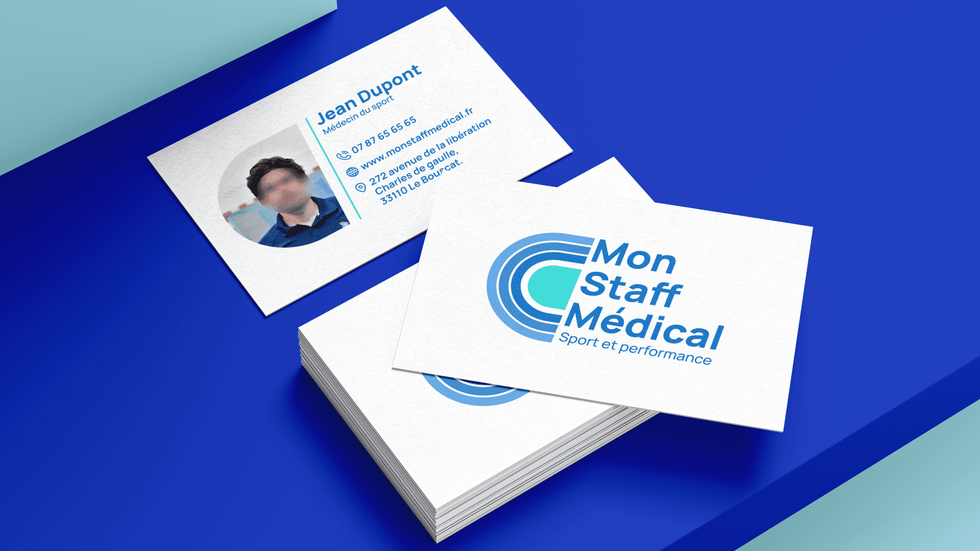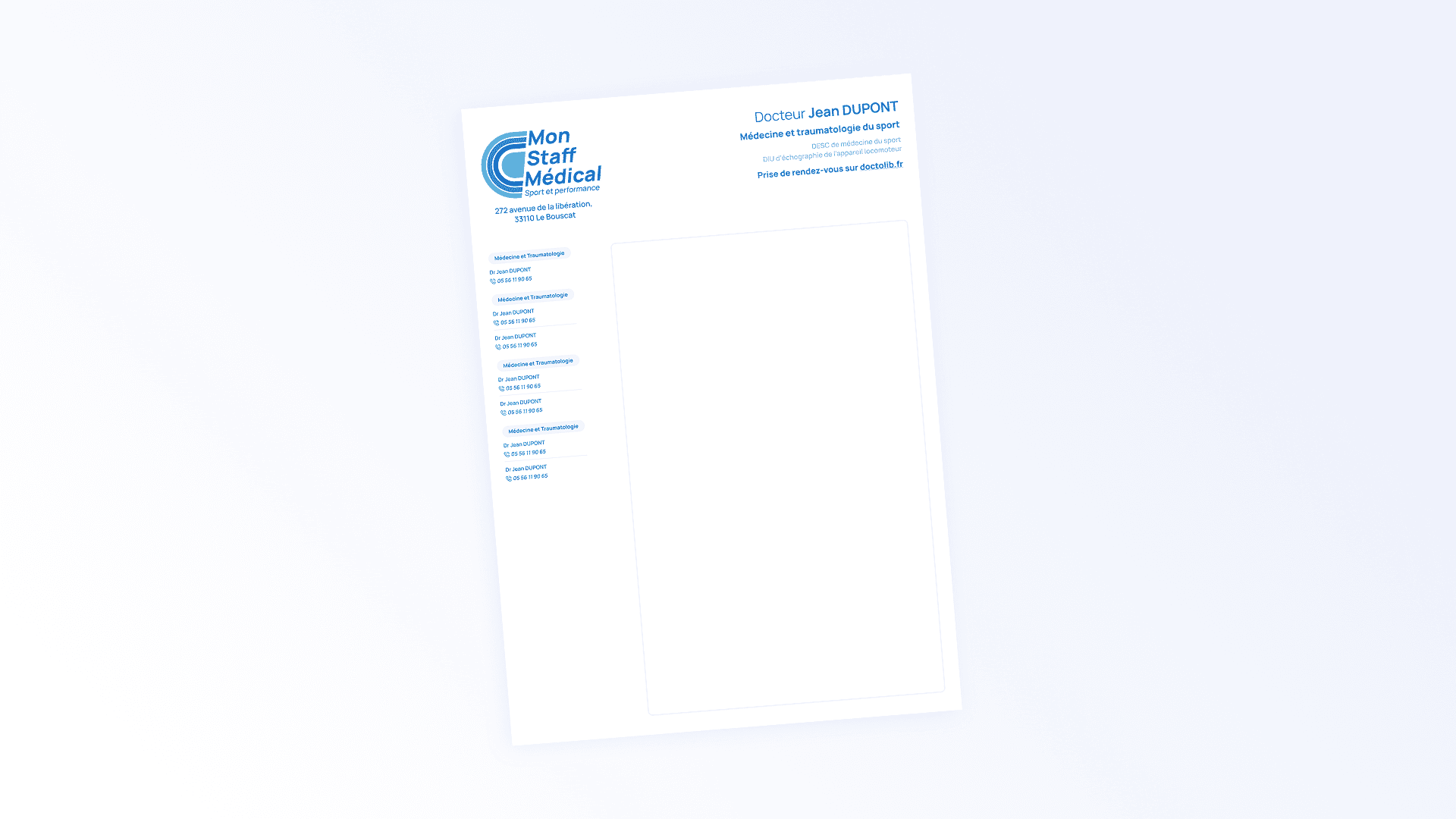 Ici, on est sur une mission en freelance pour Mon Staff Médical, un cabinet médical spécialisé dans le sport. Le projet était global : il fallait tout construire, du logo à la charte graphique, en passant par les supports indispensables du quotidien comme les cartes de visite et les templates d’ordonnance. J'ai bossé en direct avec les cinq associés du cabinet pour traduire leur expertise en une image de marque forte et pro.