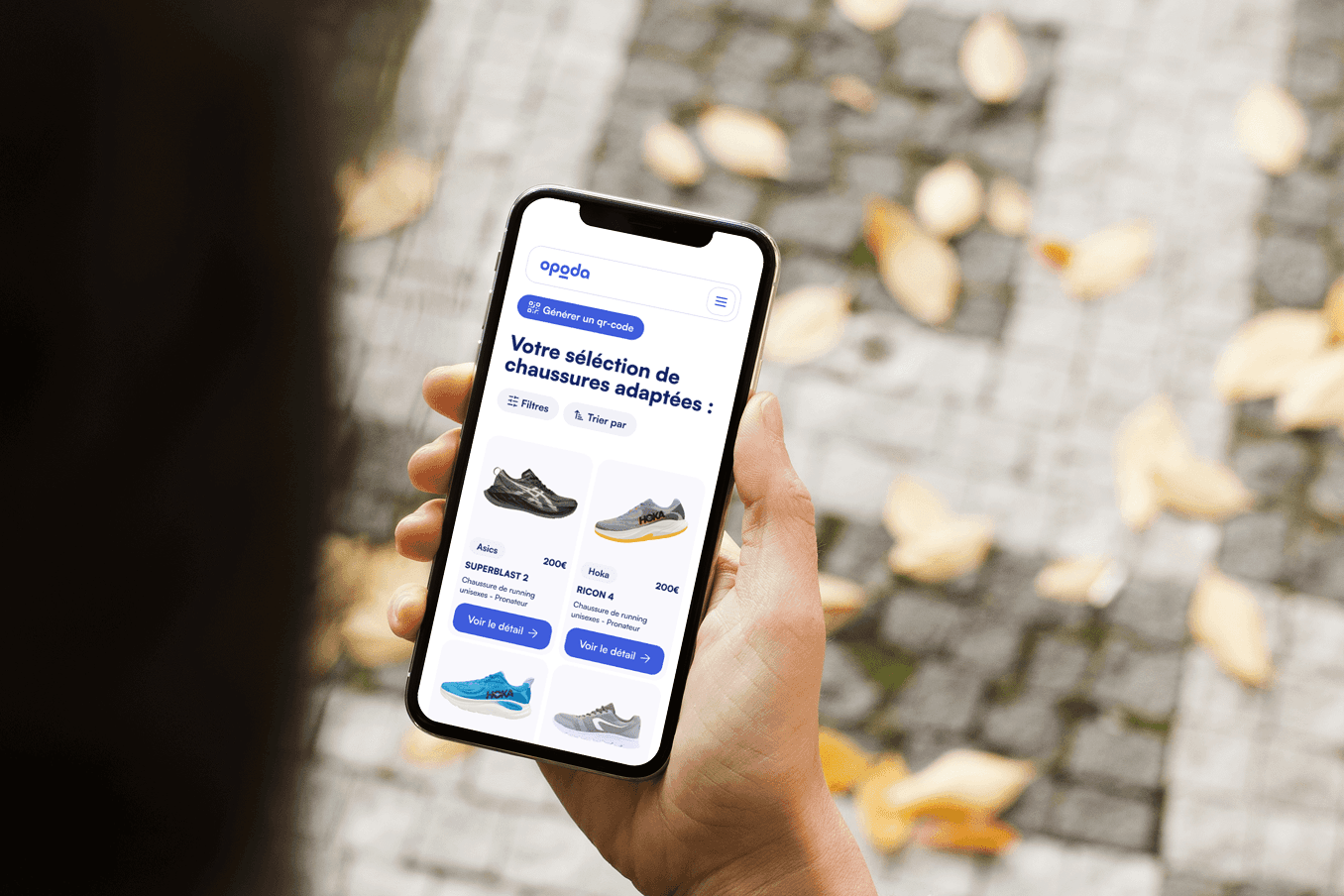 Opoda, c’est un projet né durant une "Startup Week" intensive de deux semaines à l’ESD Bordeaux. On était une équipe de quatre : deux profils marketing pour le business, une DA pour l’univers visuel, et moi au lead UX/UI Design. L’idée ? Créer une solution capable de recommander précisément les meilleures chaussures de sport en analysant la foulée et la morphologie de l'utilisateur.