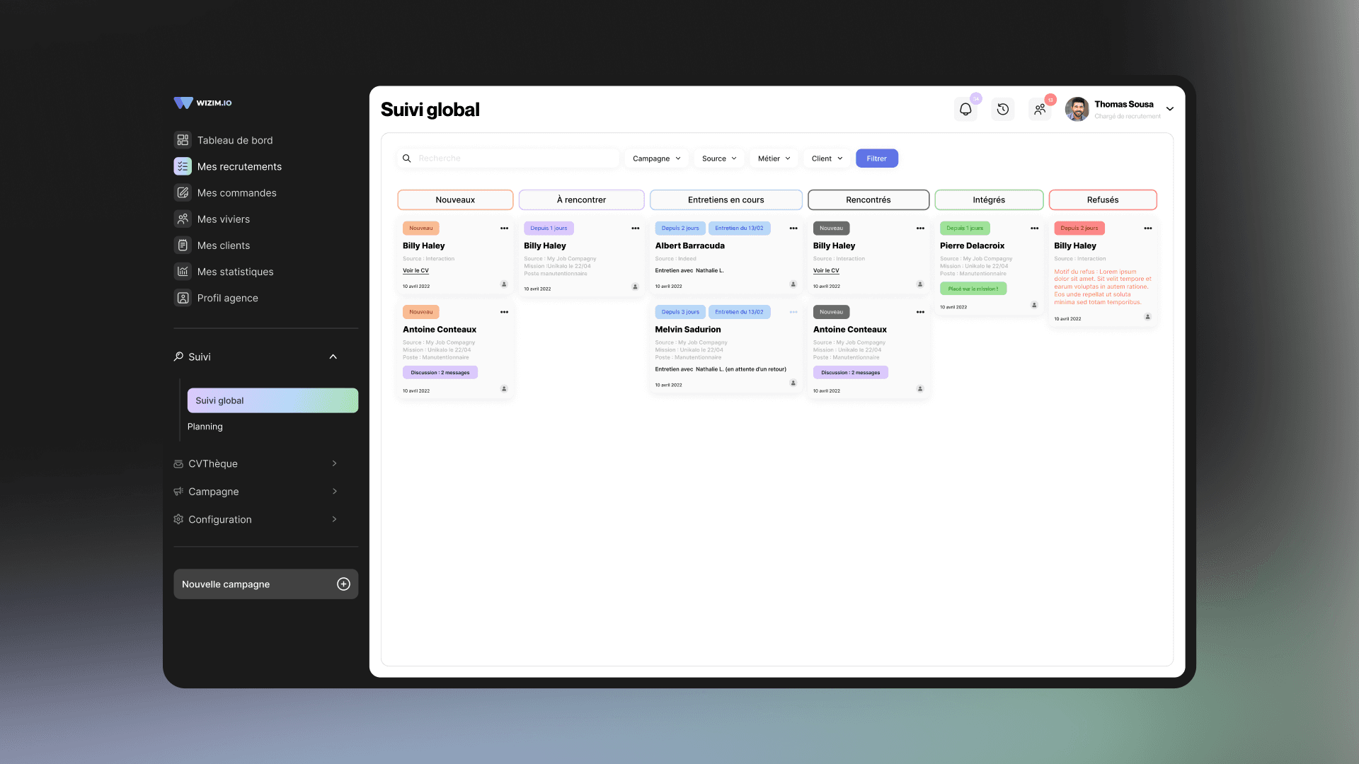 Wizim, c’est une plateforme tripartite qui connecte les trois piliers de l'intérim : l'agence, l'entreprise cliente et l'intérimaire. L'idée est simple : regrouper tout le monde au même endroit pour que le recrutement soit plus rapide et transparent.